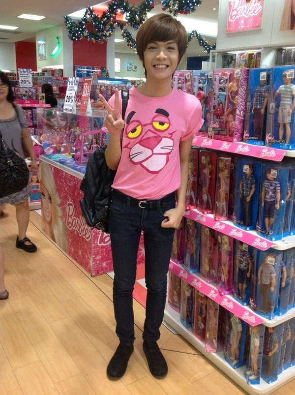 | Chàng ca sĩ trẻ nhí nhảnh tạo dáng với áo thun màu hồng cực nữ tính. |