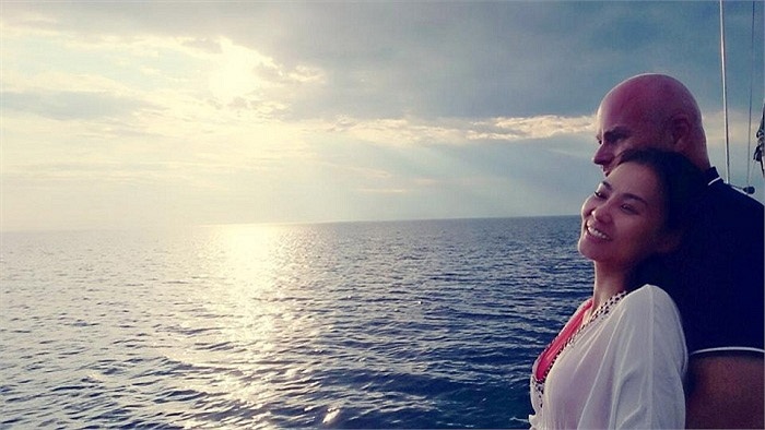| Vợ chồng Thu Minh tình cảm trên du thuyền. |