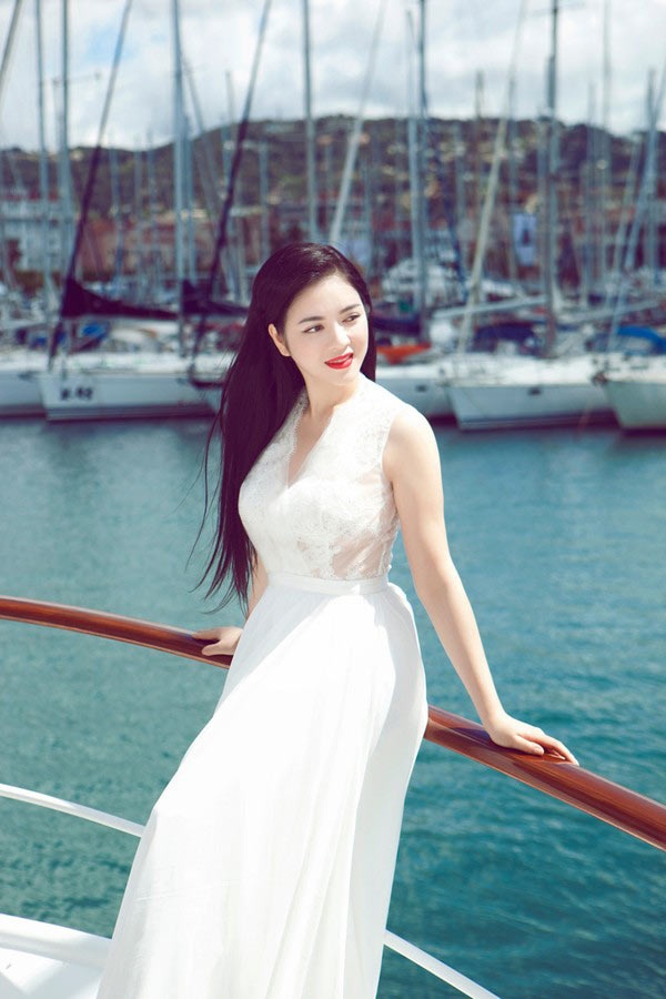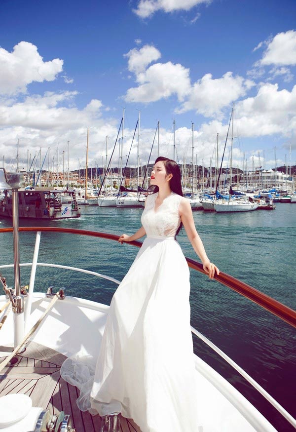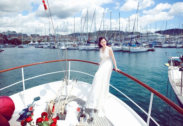 | Diễm My tạo dáng trên chiếc du thuyền chồng cô làm “đại diện”. |