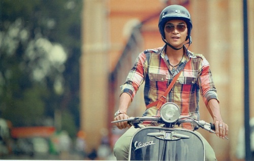 Hoàn toàn khác khi ở trên màn ảnh, diễn viên Scandal không thuộc dạng một bước lên xe hơi, hai bước lên xế sang. Hình ảnh quen thuộc của Khương Ngọc là chàng lãng tử bên cạnh chiếc Vespa Acma thuộc loại hiếm gặp.