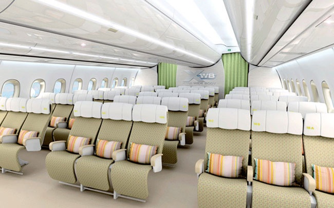 | Nội thất trong chiếc Boeing 787 rất đẹp với không gian rộng. Màu sắc đèn trong khoang có thể tùy biến theo màu đèn led được hãng bay sử dụng. |