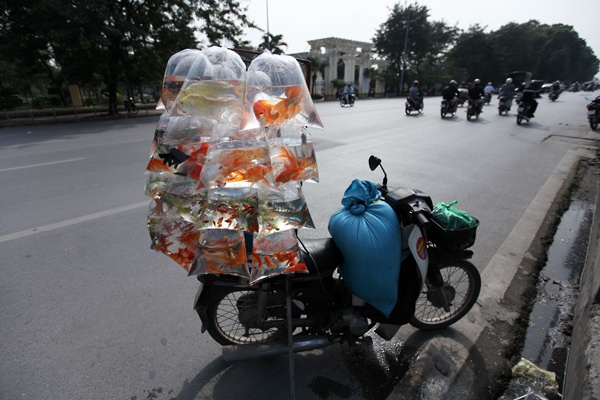 | Hàng trăm con cá cảnh, hàng chục kg thức ăn cho cá nằm gọn trên chiếc xe gắn máy chạy khắp phố Thủ đô phục vụ người mê cá cảnh. |