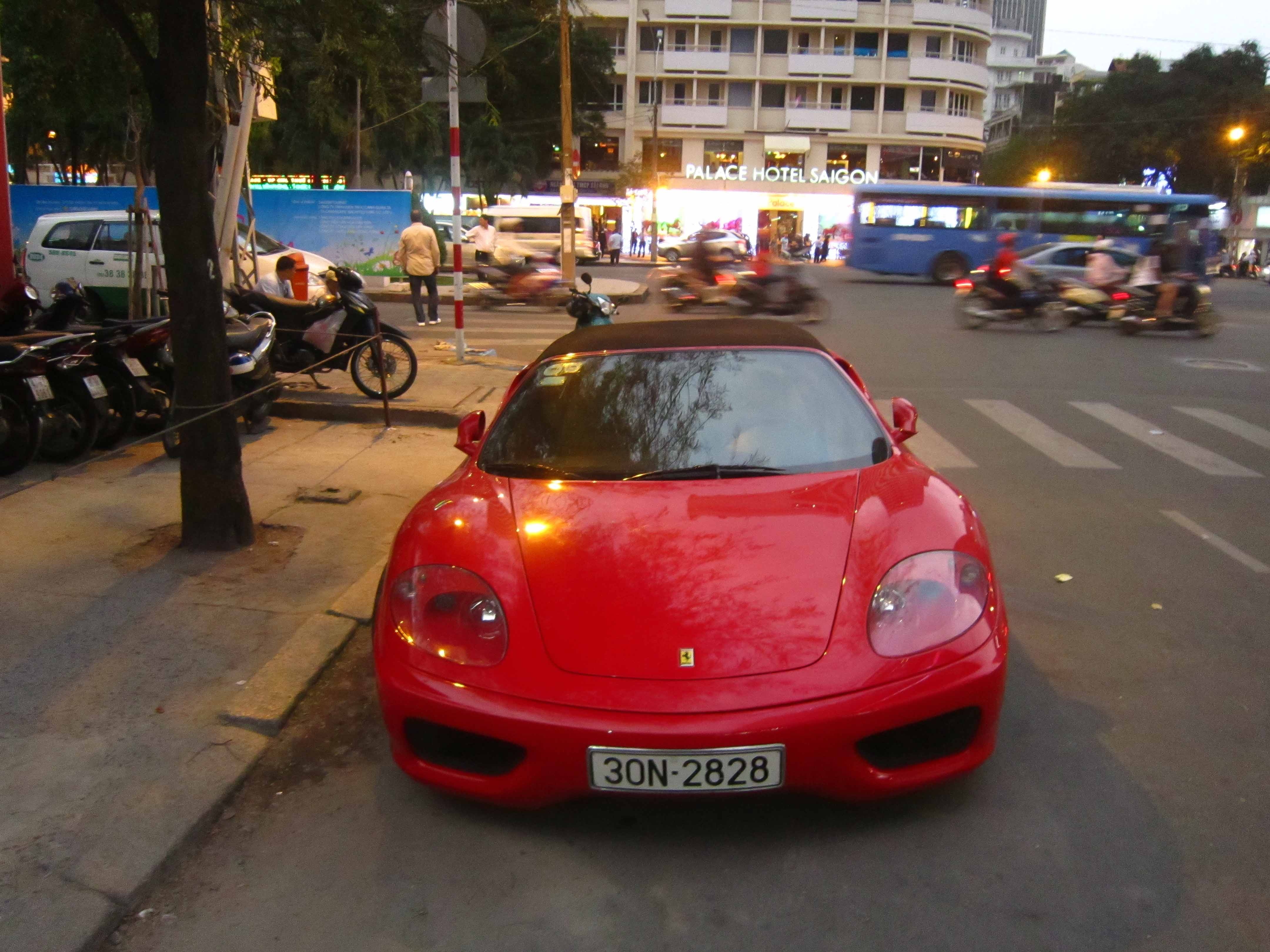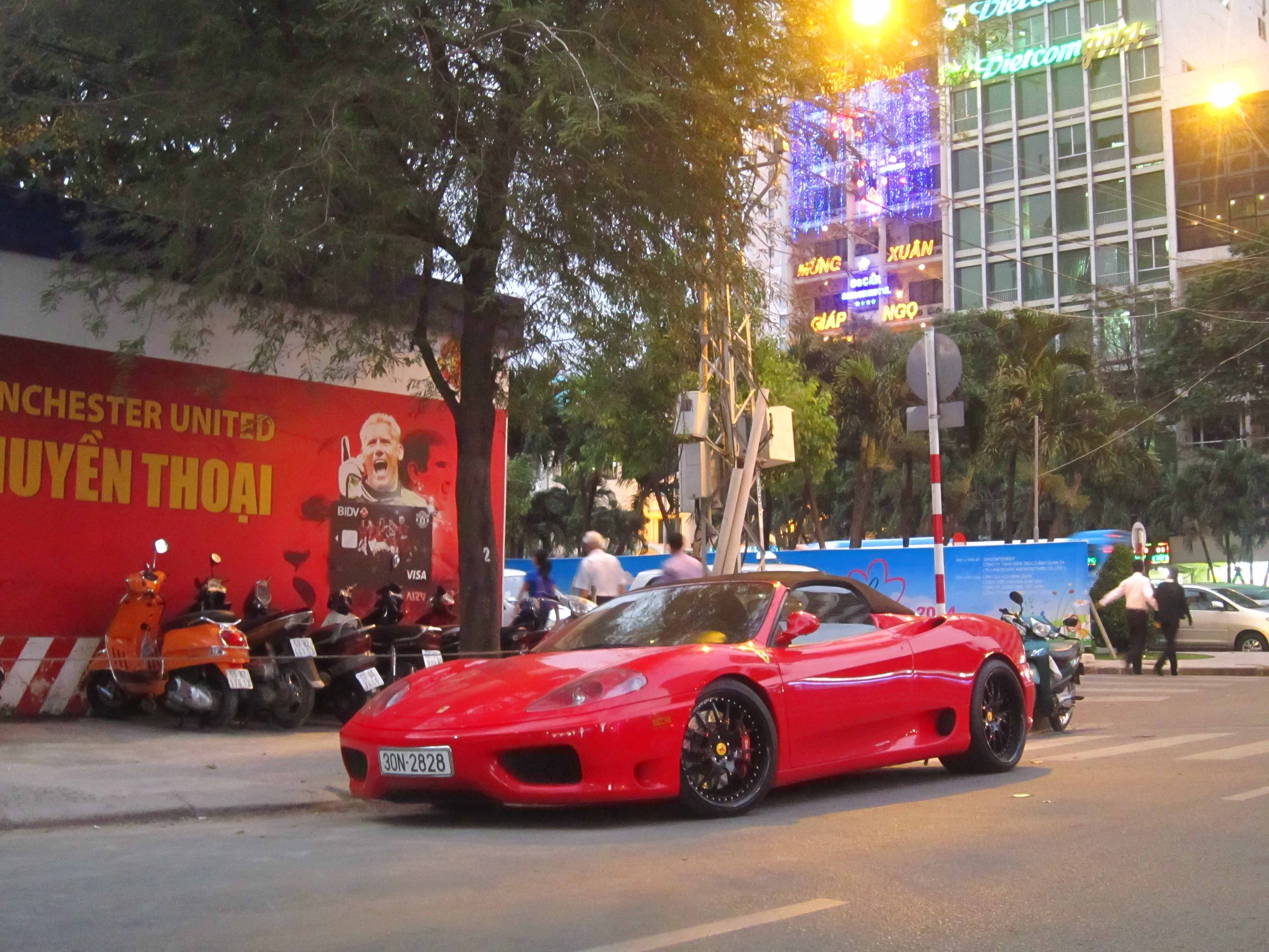 | Ferrari 360 Spider mang biển số Hà Nội tại TP HCM. Đây là thế hệ siêu xe tiền nhiệm của Ferrari F430. Chiếc xe này là niềm mơ ước của hầu hết những người đam mê xe trong những năm đầu thế kỷ 21. |