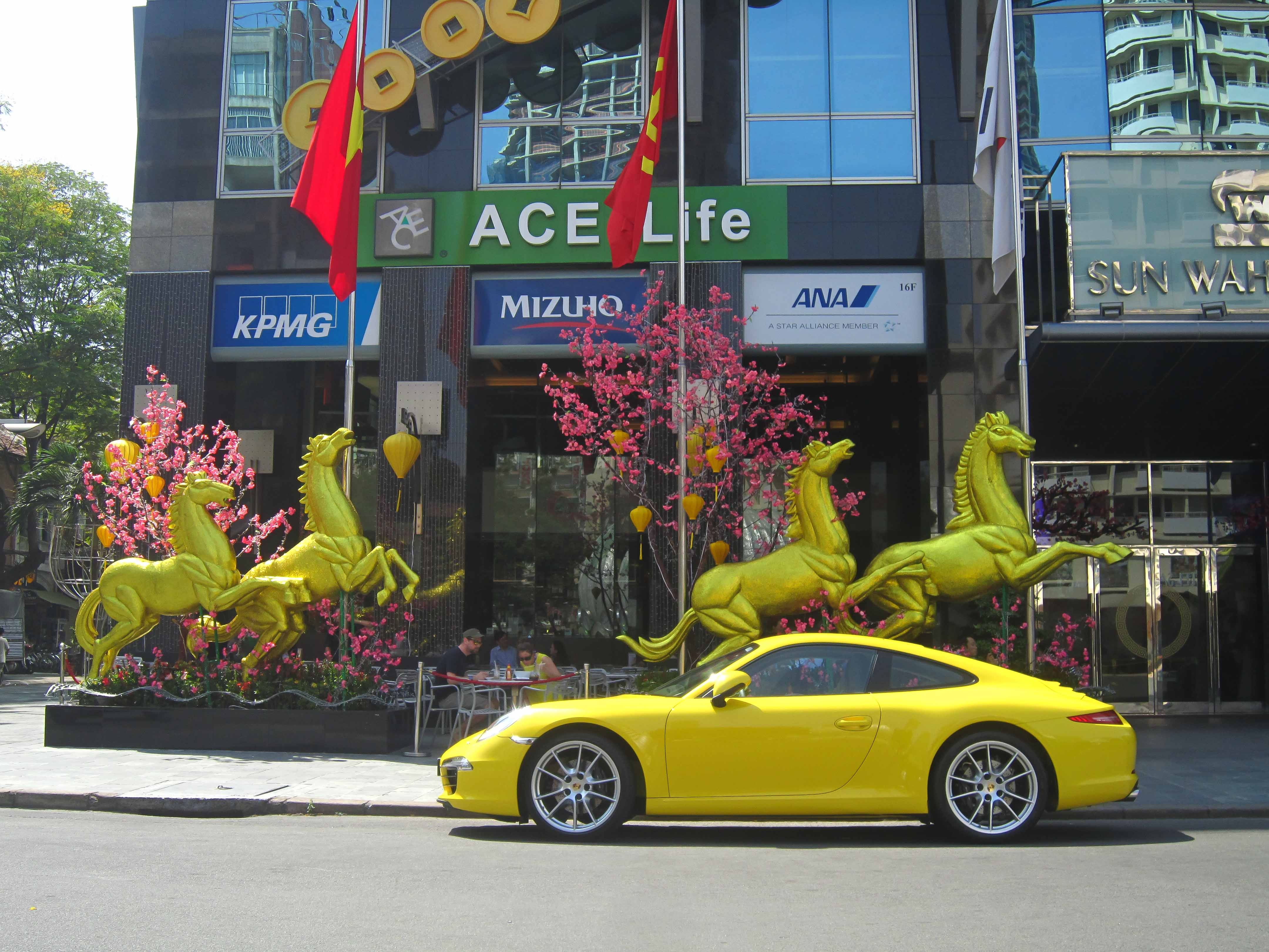 Chiếc Porsche 911 Carrera màu vàng xuất hiện trên đường hoa Nguyễn Huệ vào dịp Tết nguyên đán 2014. Đây là thương hiệu xe sang của Đức.