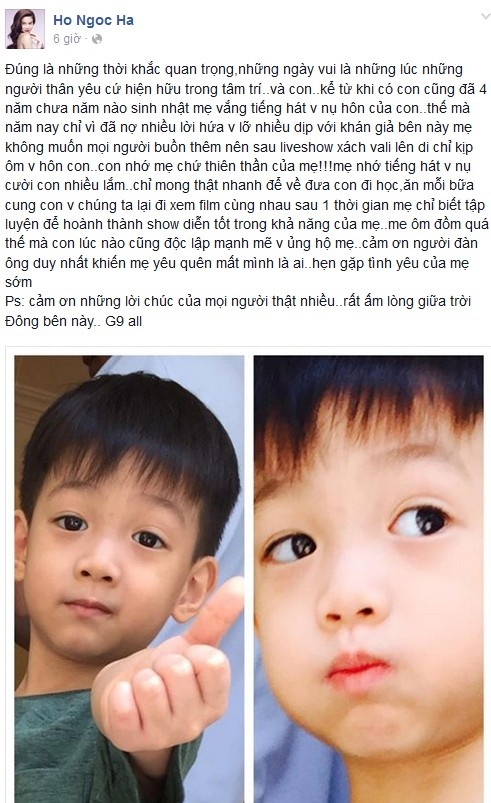 | Hồ Ngọc Hà đón tuổi 30 không có con trai bên cạnh: Theo lời chia sẻ của Hồ Ngọc Hà trên trang cá nhân, trong suốt 4 năm qua, kể từ khi có Su Beo, năm nào cô cũng đón mừng tuổi mới bên cạnh con trai: "Chưa năm nào sinh nhật mẹ vắng tiếng hát và nụ hôn của con. Thế mà năm nay, chỉ vì đã nợ nhiều lời hứa, lỡ nhiều dịp với khán giả bên này, mẹ không muốn mọi người buồn thêm, nên sau liveshow, xách vali lên đi chỉ kịp ôm và hôn con". |