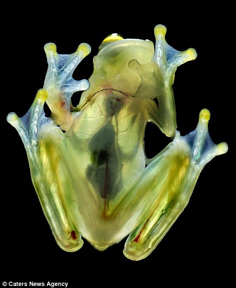 | Hầu như mọi cơ quan nội tạng của con ếch gương màu xanh nhạt này đều bị phơi bày trước ánh sáng. Các cá thể ếch gương thường được tìm thấy tại các khu rừng ở Trung và Nam Mỹ. |
