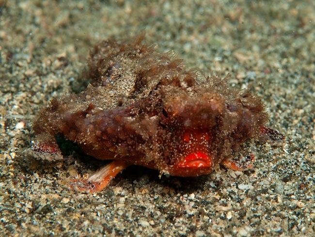 Cá dơi môi đỏ, tên khoa học Ogcocephalus darwini, sinh sống ở vùng biển nhiệt đới, chủ yếu tại đảo Galapagos, Ecuador. Chúng không bơi mà sử dụng hai vây để "đi" như chân. Cái miệng đỏ đặc trưng có nhiệm vụ thu hút bạn tình hoặc làm vũ khí chống lại con mồi. Ảnh: Flickr