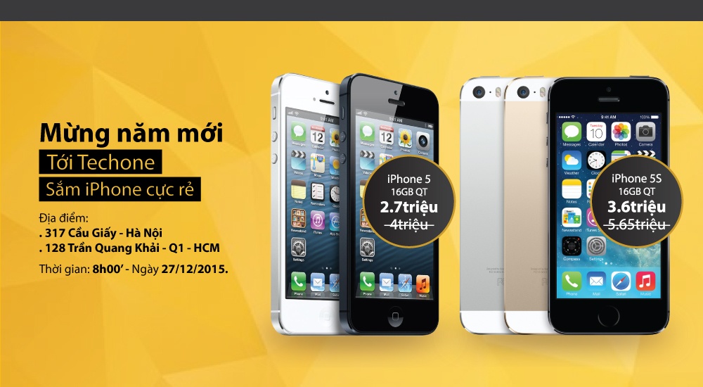 8h30 ngày 27/12, tham dự ngày vàng TechOne 317 Cầu Giấy, Hà Nội và 128 Trần Quang Khải, quận 1, TP HCM để mua iPhone giá rẻ. iPhone 5 quốc tế chỉ còn 2,7 triệu đồng (giá niêm yết 4 triệu đồng), iPhone 5S quốc tế chỉ 3,6 triệu đồng (giá niêm yết 5,65 triệu đồng) và hàng chục sản phẩm khác có giá giảm từ 10-50%.