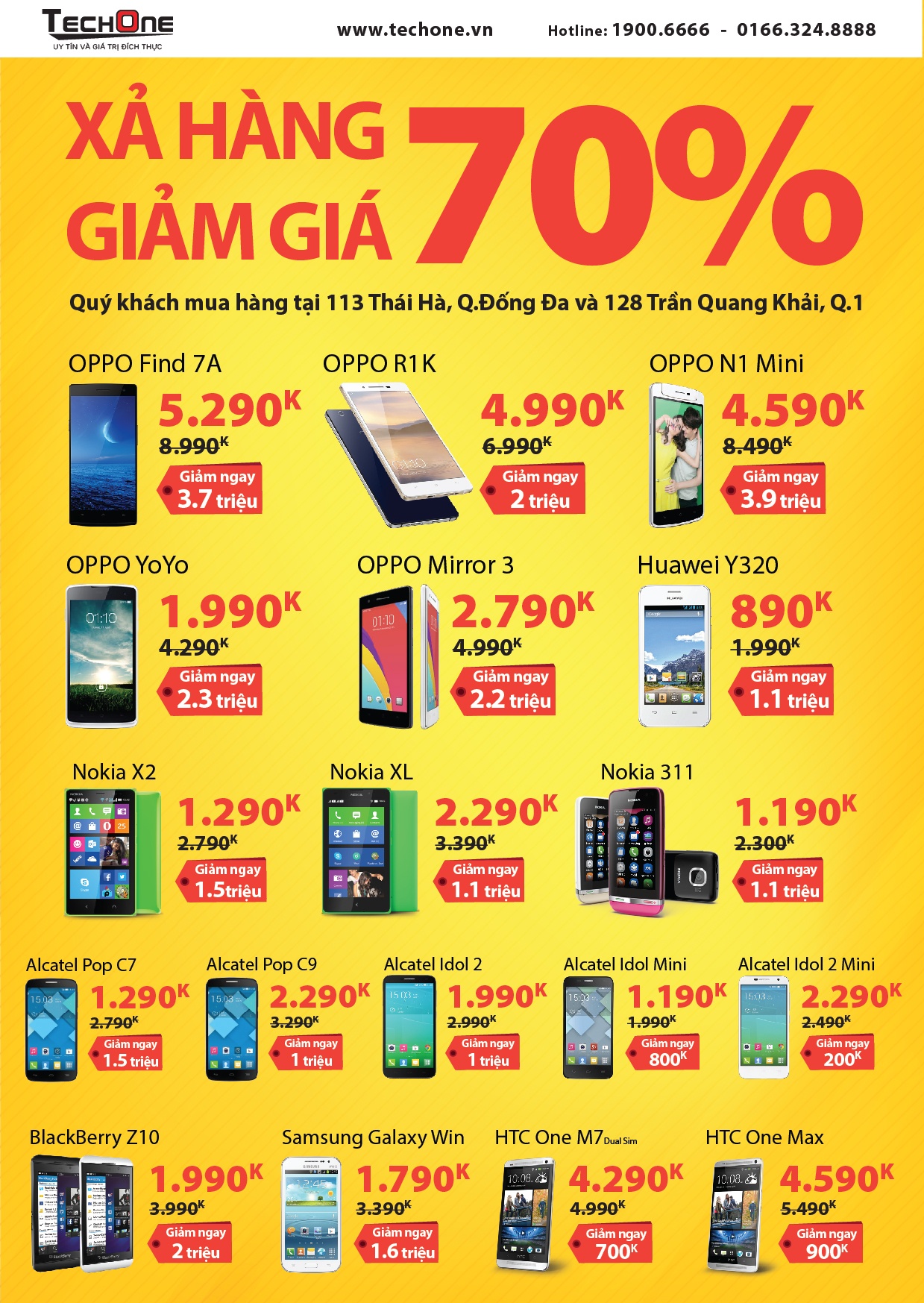 Nằm trong chuỗi chương trình tri ân khách hàng đã ủng hộ cho TechOne trong suốt thời gian qua, mùa hè này, TechOne sẽ cùng kết hợp với OPPO, HUAWEI và PISEN triển khai loạt chương trình giảm giá Giờ vàng cực shock, lên tới 70% lần lượt tại các điểm bán trên toàn hệ thống. Trong khung giờ 9h -11h duy nhất một ngày 5/7, TechOne 45 Hàng Bài sẽ có chương trình giờ vàng giảm giá tới 70%: iPhone 5 chỉ còn 2,9 triệu đồng, OPPO Neo 5 chỉ 2,19 triệu, Huawei Y541 chỉ 899.000 đồng… và hàng chục model khác được giảm giá tới 2 triệu đồng.