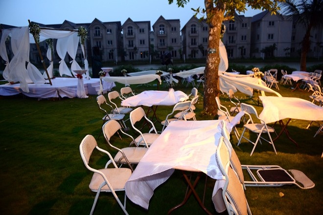| Đám cưới của "họa mi" dự kiến tổ chức ngay trên thảm cỏ xanh mướt, nhưng mưa gió kéo tới quá nhanh nên không gian lãng mạn trở nên tan hoang. |