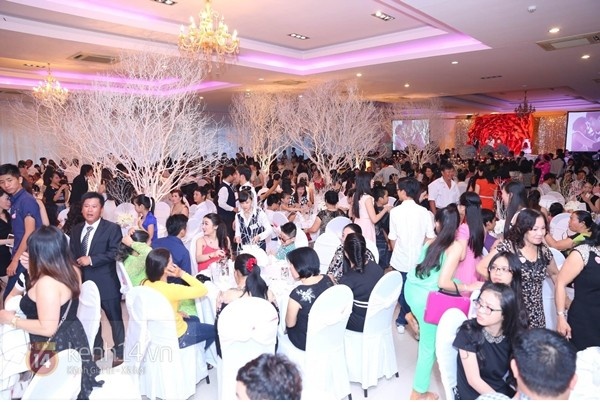 | Tuy nhiên, số khách mời có mặt lại đông vượt trội so với dự kiến, trong đó có cả những suất "đi kèm" với vé mời của khách khiến hội trường tổ chức đám cưới chật kín. |