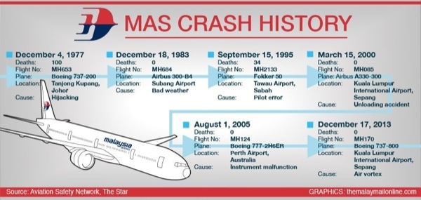 8/3/2014: Đây có thể sẽ là vụ tai nạn tồi tệ nhất trong lịch sử Malaysia Airlines khi chiếc Boeing 777-200 chở 227 hành khách và 12 thành viên phi hành đoàn bị rơi cách đảo Thổ Chu, Kiên Giang 300 km. Theo dự định ban đầu, chiếc máy bay sẽ hạ cánh xuống sân bay quốc tế Bắc Kinh vào sáng sớm, sau khi khởi hành từ sân bay quốc tế Kuala Lumpur.
