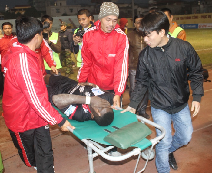 | Danny phải đi cấp cứu sau pha đạp người thô bạo của cầu thủ nhập tịch Đinh Văn Ta. |
