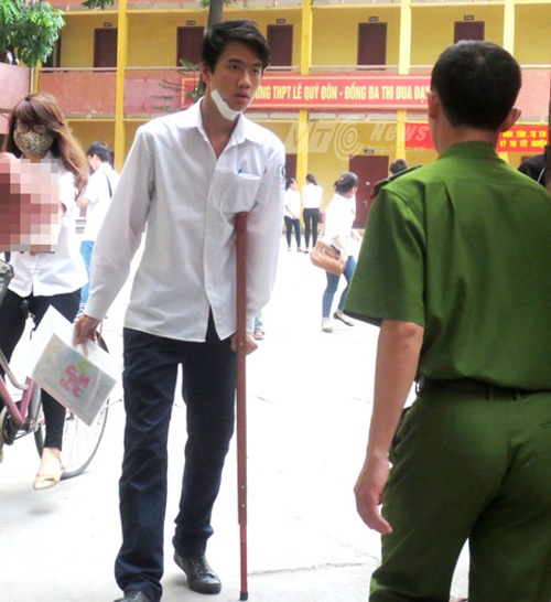 | Thí sinh Trịnh Duy Linh chống nạng đến phòng thi (Ảnh: VTC News). |