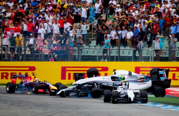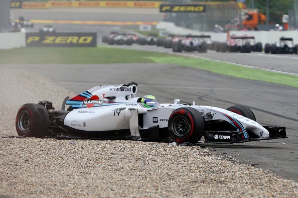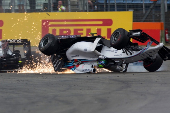 | Và ở ngay góc cua đầu tiên, tai nạn kinh hoàng đã xảy ra khi chiếc MP4-29 của Kevin Magnussen (McLaren) húc vào phía sau chiếc FW36 của Felipe Massa (Williams) khiến chiếc xe của tay đua người Brazil lộn nhào và tóe lửa. |