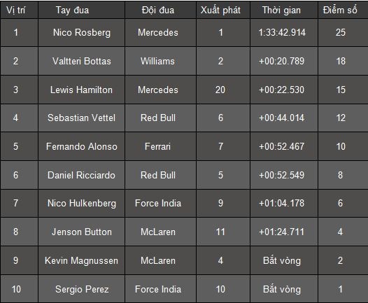 | Với lợi thế quá lớn và đặc biệt không phải cạnh tranh cùng đối thủ nguy hiểm nhất - đồng đội Lewis Hamilton , Rosberg liên tục lập fastest lap để bỏ xa các đối thủ bám đuổi phía sau. Sau 1 giờ 33 phút 42,914 giây, ngôi sao người Đức là người cán đích đầu tiên. |