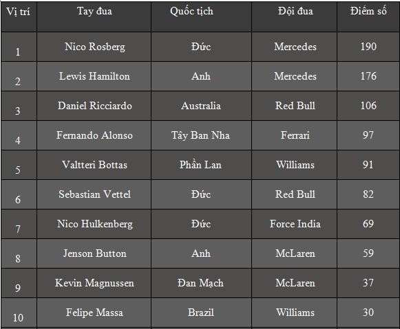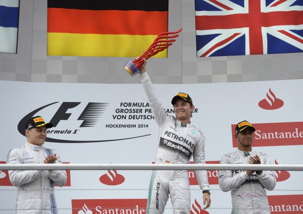 | Với 25 điểm có được từ chiến thắng chặng German GP, Rosberg lúc này có trong tay tổng cộng 190 điểm, bỏ xa tay đua xếp thứ 2 là Hamilton 14 điểm. Đây cũng là lần đầu tiên kể từ mùa giải 1954 (huyền thoại Juan Manuel Fangio đăng quang), Mercedes mới lại sở hữu một tay đua thắng chặng trên sân nhà. |