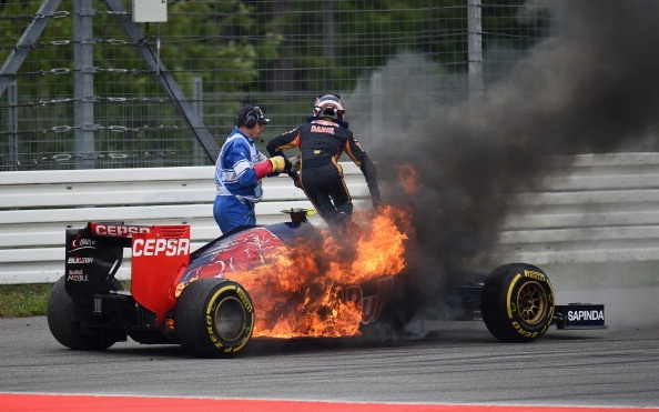 | Chiếc STR9 của Daniel Kvyat (Toro Rosso) cũng gặp nạn khi chặng đua chỉ còn vài vòng nữa là kết thúc. |