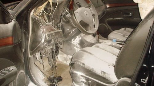 | Lúc này có một số tài xế taxi và người dân xung quanh chạy đến dùng bình chữa cháy dập lửa đang phát ra từ cabin và buồng lái. "Nếu không kịp thời nhảy ra khỏi xe, có lẽ tôi đã bị bỏng nặng" - Lê Khánh bàng hoàng kể lại. Ảnh chụp bên trong chiếc xe bị cháy của nữ diễn viên. |
