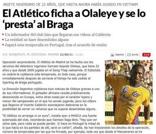Vào năm 2011, tờ Marca đăng tải thông tin về việc Atletico Madrid đã đạt thỏa thuận với Samson Kayode (lúc đó thi đấu cho đội Tập đoàn cao su Đồng Tháp) theo dạng chuyển nhượng tự do. Tuy nhiên, về sau Samson đã không thể đến TBN thi đấu do đã ký hợp đồng với Hà Nội-T&T từ trước.
