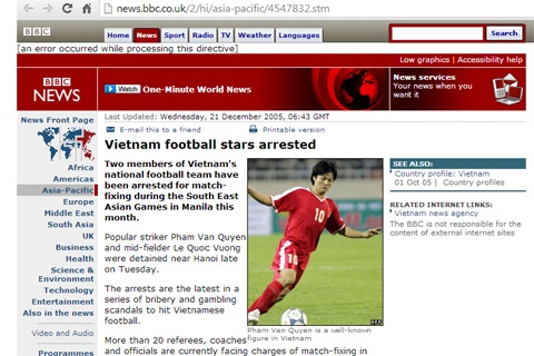 Dưới tiêu đề bài viết “Ngôi sao bóng đá Việt Nam bị bắt”, hãng tin BBC của Anh đã miêu tả chi tiết việc 2 tài năng trẻ của bóng đá Việt Nam là Phạm Văn Quyến và Lê Quốc Vượng phải hầu tòa vì bán độ tại SEA Games 23.