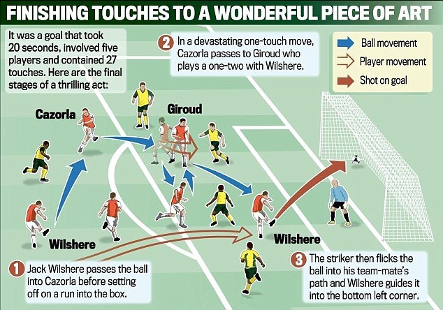 | Siêu phẩm của Arsenal được thực hiện trong trận gặp Norwich. Xuất phát từ Jack Wilshere, bóng được chuyền cho Cazorla, sau đó tiền vệ người Tây Ban Nha chuyền cho Giroud để cầu thủ này phối hợp một chạm với Jack Wilshere. Bàn thắng của Arsenal được thực hiện trong 20 giây. |