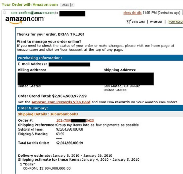 Có người đã mua chiếc đĩa CD trị giá tới gần 3 tỷ USD trên trang web, song vẫn phải trả thêm 3,99 USD phí vận chuyển. Song Amazon đã hủy đơn hàng này.