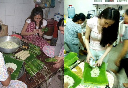 | Thuỷ Tiên luôn tự tin rằng mình có khiếu nhất trong việc gói bánh chưng, bánh tét. Mới đây, cô cũng nhận được nhiều lời khen khi trổ tài nội trợ chăm sóc chồng con. |