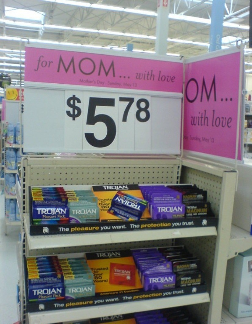 | Đợt giảm giá mừng Ngày của mẹ của Walmart sẽ trở nên ý nghĩa hơn rất nhiều nếu thông điệp: "Dành tặng mẹ với tình yêu" này không đặt ở kệ hàng bán bao cao su. |