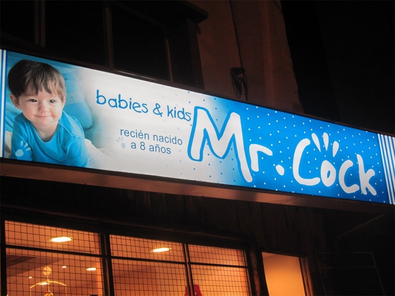| Từ Cock ở Argentina vốn không có nhiều vấn đề, song trong tiếng Anh thì không như vậy khi nó ám chỉ bộ phận sinh dục của nam giới. Vậy nên nếu đây là tên cửa hàng chuyên bán đồ cho trẻ em thì sẽ rất kỳ quặc. |