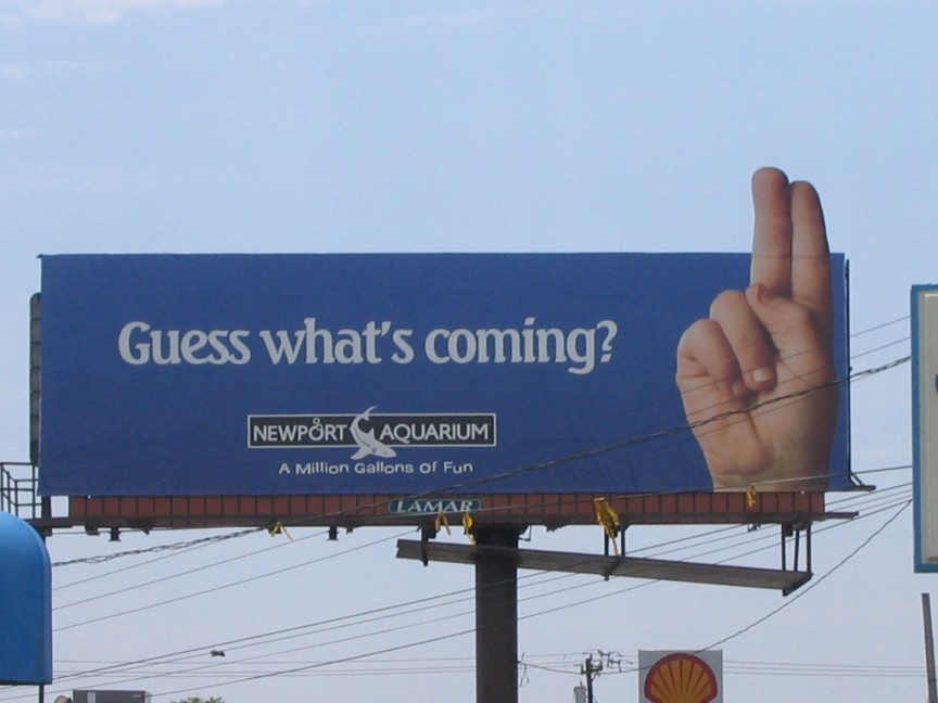 | "Đoán xem điều gì sẽ xảy ra" là thông điệp gửi đến trong quảng cáo từ công viên hải dương Newport Aquarium, Mỹ. Tuy vậy, người ta tự hỏi, hình ảnh 2 ngón tay ở đây tượng trưng cho điều gì? |