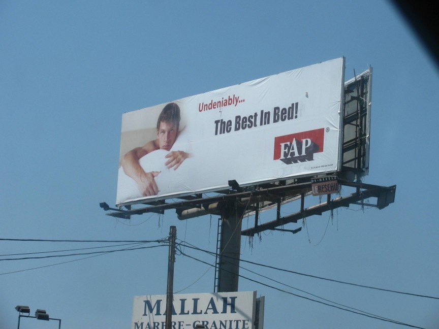 | FAP là tên một cửa hàng bán đệm ở Lebanon mà kết quả là quảng cáo của nó được chia sẻ rộng rãi trên Internet bởi những người dân Bắc Mỹ. Rõ ràng, từ "FAP" khiến người ta hình dung đến những hình ảnh riêng tư của các cặp đôi khi ở trên giường, và nó không nên được công khai như thế này. |