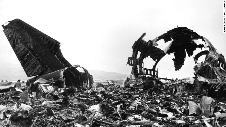 | Ngày 27/3/1977, hai chiếc Boeing 747 đâm vào nhau trên đường băng của sân bay Los Rodeos, nay là sân bay Tenerife Norte, Tây Ban Nha. Một chiếc của hãng hàng không KLM Royal Dutch Airlines và phi cơ còn lại là của hãng hàng không Pan Am. Vụ tai nạn khiến 583 người thiệt mạng. Ảnh: Getty Images. |