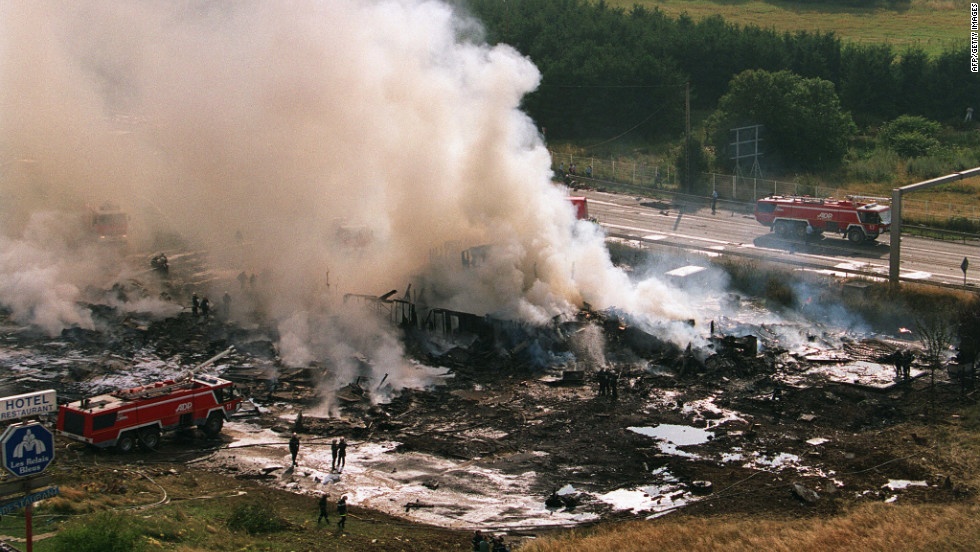 | Hôm 25/7/2000, máy bay siêu thanh Concorde của hãng hàng không Air France gặp nạn khi vừa cất cánh khỏi sân bay Charles de Gaulle, Pháp. Theo Reuters, những mảnh kim loại rớt lại trên đường băng của các máy bay khác đã khiến lốp của Concorde bị nổ, bắn văng ra và làm vỡ một bình chứa nhiên liệu. Phi cơ bốc cháy và đâm vào một khách sạn khiến 109 người trên máy bay và 4 người trên mặt đất thiệt mạng. Ảnh: Getty |