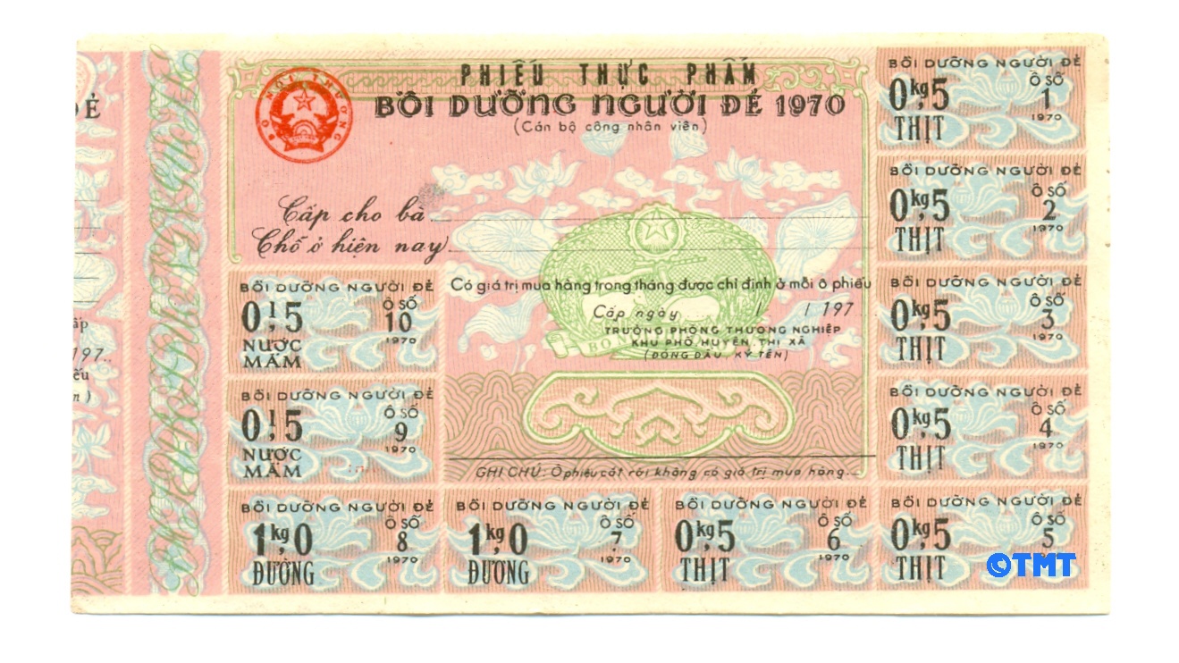 | Đối với người đẻ thuộc diện dân nông thôn năm 1970 chỉ được cấp 1 lít nước mắm và 2 kg đường. Phiếu thực phẩm bồi dưỡng người đẻ này cũng giống như chế độ thai sản nghỉ đẻ hiện giờ. |