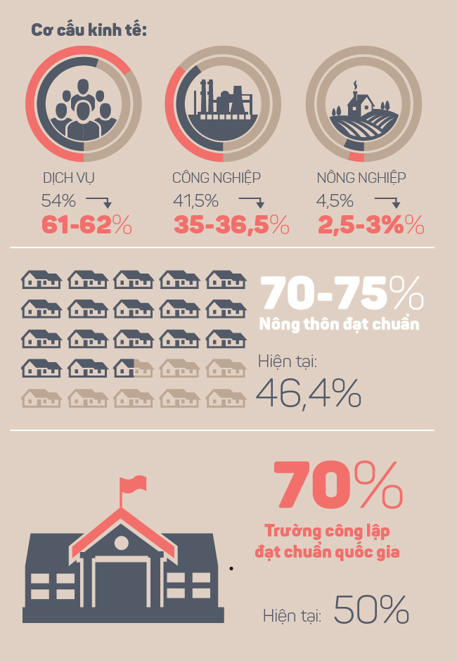 Theo chỉ tiêu phát triển kinh tế xã hội của thành phố, thu nhập bình quân đầu người đến năm 2020 sẽ đạt 140-150 triệu đồng, tương đương 6.700 - 6.800 USD/năm; thu nhập bình quân ở nông thôn đạt 45 triệu đồng. Dịch vụ sẽ chiếm tới 61-62%, công nghiệp – xây dựng 35-36,5%, nông nghiệp 2,5-3% GDP.