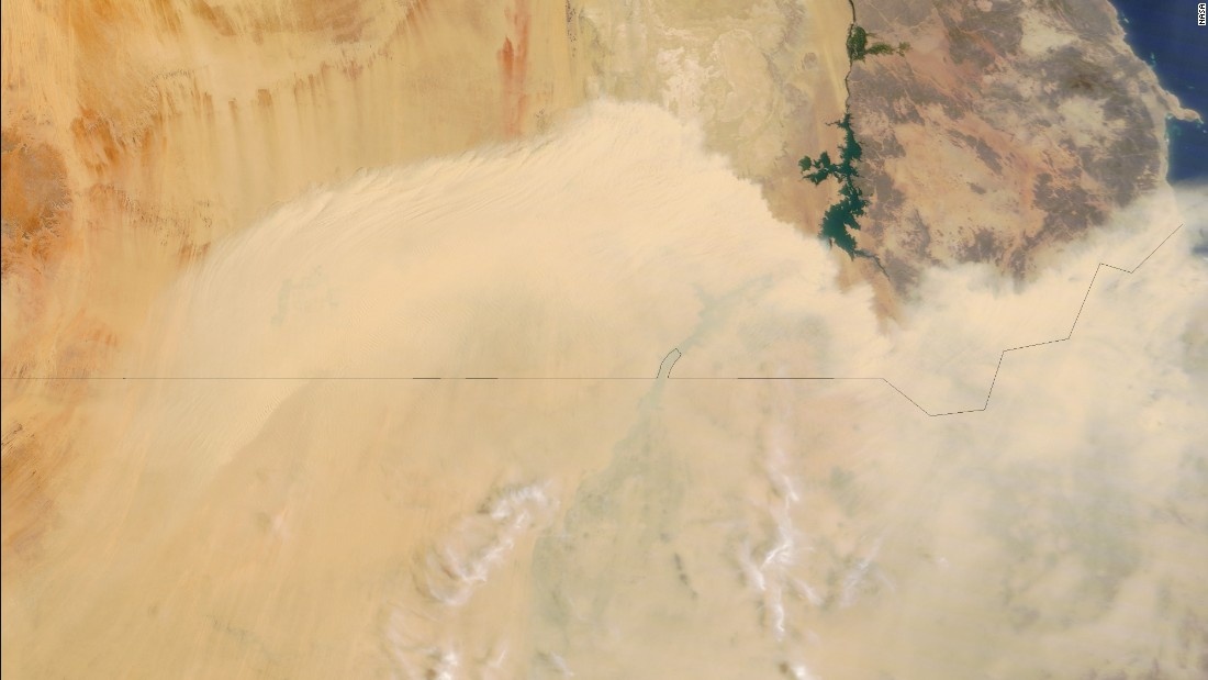 | Hình ảnh một bức tường cát bụi khổng lồ kéo dài từ phía bắc Sudan tới phía nam Ai Cập do vệ tinh Terra của NASA chụp hôm 6/8. |