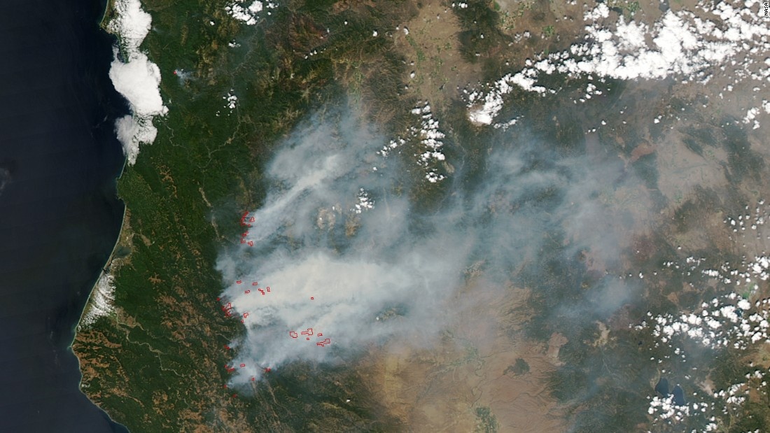 | Vệ tinh Aqua của NASA chụp các đám khói lớn trong trận cháy rừng ở bang Oregon và California hôm 5/8. Các chấm đỏ là điểm nóng trong các vụ hỏa hoạn. Đám cháy lớn thiêu rụi hơn 24.000 km2 rừng ở khu vực miền Tây nước Mỹ. Khoảng 80% khu vực cháy thuộc các cánh rừng hẻo lánh ở bang Alaska song lửa cũng lan sang rừng thuộc các bang Oregon, Washington và phía bắc California. |