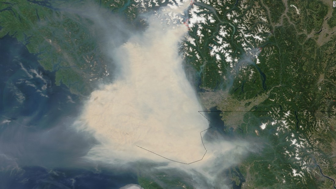 | Hình ảnh do vệ tinh Terra cung cấp cho thấy đám cháy lớn tại miền Tây Canada tạo ra làn khói dày đặc bao trùm thành phố Vancouver và các khu vực lân cận hồi đầu tháng 7. Nhiều người dân phải đeo mặt nạ bảo hộ để đảm bảo sức khỏe. |