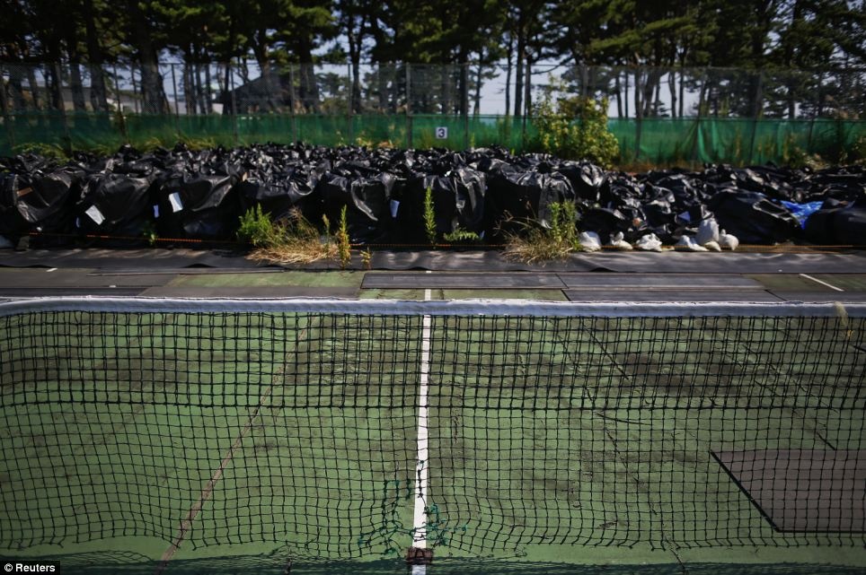 Những túi nilon chứa đất nhiễm chất phóng xạ nằm ở một khu vực trong thành phố Fukushima. Khoảng 80.000 người dân phải sơ tán do chính quyền áp đặt một khu vực cấm có bán kính 20 km xung quanh nhà máy điện hạt nhân Fukushima sau thảm họa động đất, sóng thần vào ngày 11/3/2011 Ảnh: Reuters