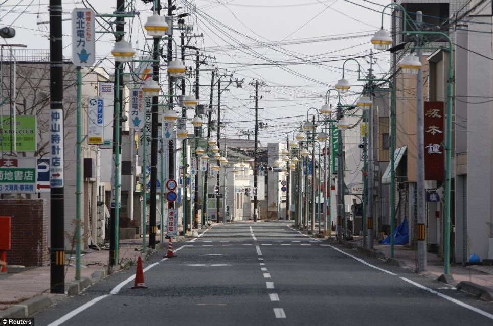Đường nứt, xe đạp nằm chỏng chơ, bóng đèn vẫn sáng là cảnh tượng tại các thành phố xung quanh nhà máy điện Fukushima sau thảm họa kép năm 2011.