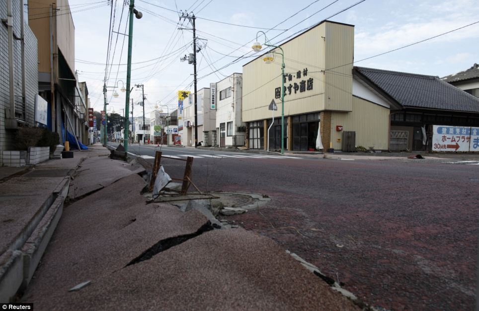 Một đoạn đường tại thành phố Tomioka nứt vì động đất. Ảnh: Reuters