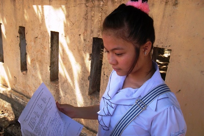 Ngày 4/6, em Cao Nữ Phương Thảo (SN 1994, học sinh lớp 12/2, trường THCS và THPT Bắc Sơn, Tuyên Hóa, Quảng Bình) cũng trở thành tâm điểm của dư luận. Tương tự hai thí sinh trên, Phương Thảo là sĩ tử duy nhất tại hội đồng thi, với 27 người phục vụ. Điểm khác biệt là em thi môn Tiếng Anh. (Ảnh: Văn Được).