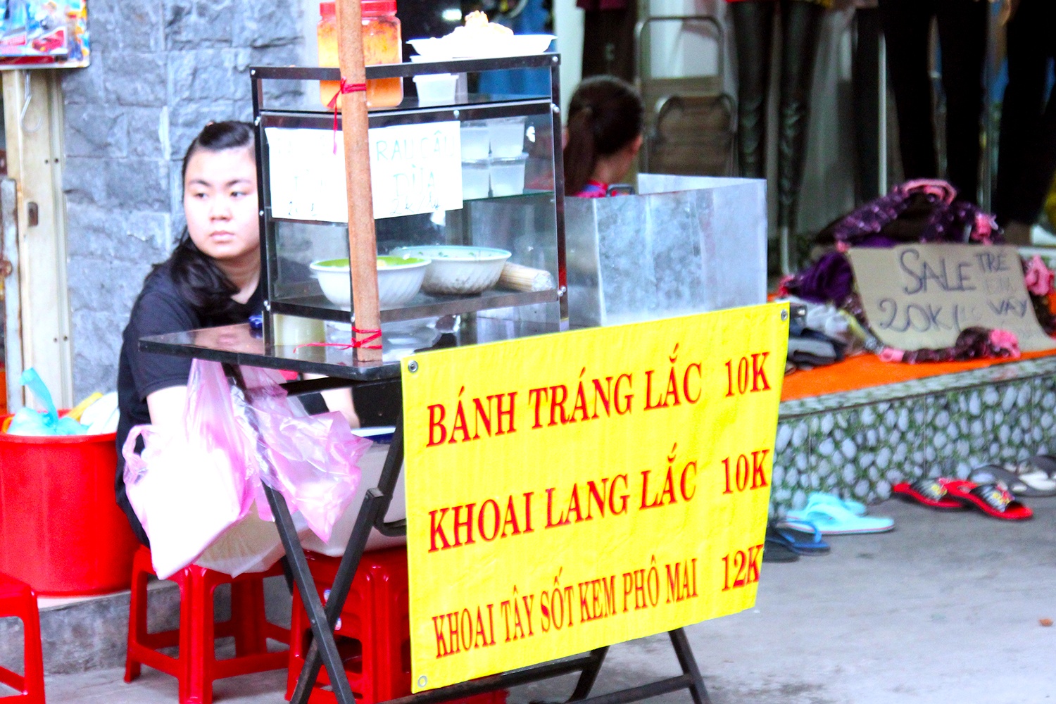 | "Bánh tráng lắc, khoai lang lắc", món ăn khá lạ với giá 10.000 đồng khá hút khách đến đây. |