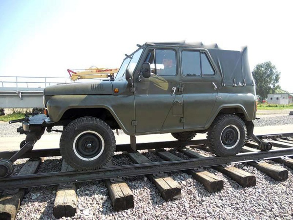 Một chiếc xe UAZ của Nga được lắp cơ cấu chuyển động mới để nó có thể di chuyển trên đường ray. |