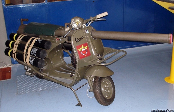 Một chiếc Vespa của hãng Piagio (Italy) được gắn thêm một khẩu súng phản lực kiểu bazooka với 6 quả đạn đeo mỗi bên xe. Pháp sử dụng mẫu xe gắn súng phản lực trong chiến tranh Algeria cuối thập niên 50. |