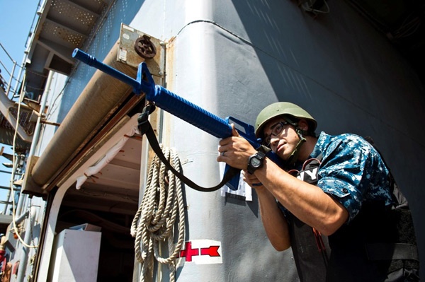 Một người lính hải quân Mỹ đang sử dụng một khẩu súng M-16 được sơn xanh dương toàn bộ. Những khẩu súng dành cho luyện tập sẽ được sơn màu này. Quân đội Mỹ cũng có cách đánh dấu súng tập khác như sơn màu sặc sỡ đầu nòng, gắn một thiết bị đặc biệt tạo ở đầu nòng nhằm tạo độ rung, nảy như khi bắn thực tế. |