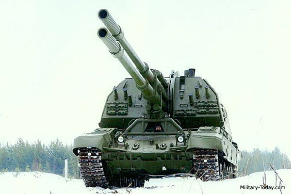 Siêu pháo tự hành 2 nòng Koalitsija-SV được phát triển từ khung gầm xe tăng T-90. Việc tăng gấp đôi số lượng nòng pháo giúp nó tăng tốc độ bắn, thay đổi góc bắn linh hoạt, kéo dài tuổi thọ nòng pháo. |