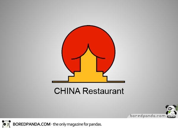 Trên hình, logo của một nhà hàng Trung Quốc làm người ta khó mà nhịn nổi cười. Đó là khi mặt trời màu đỏ kết hợp cùng chiếc mái nhà cong trông như hình cái mông.