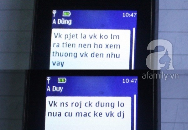 Trong tin nhắn gửi đi, Th. có nhắc đến chuyện: “Giờ vợ biết đi đâu đây”, “Bây giờ đi đâu”, “Qua 5/5 sẽ đi” (5/5 âm lịch là Tết Đoan Ngọ, tức là ngày 2/6 vừa qua)... nhưng là với 2 chàng trai khác nhau. Một tên Duy, người kia tên Dũng. Cao trào nhất phải kể đến hai tin nhắn “Em nguyện suốt đời yêu mình anh” dành cho 2 chàng trai này cùng một thời điểm.